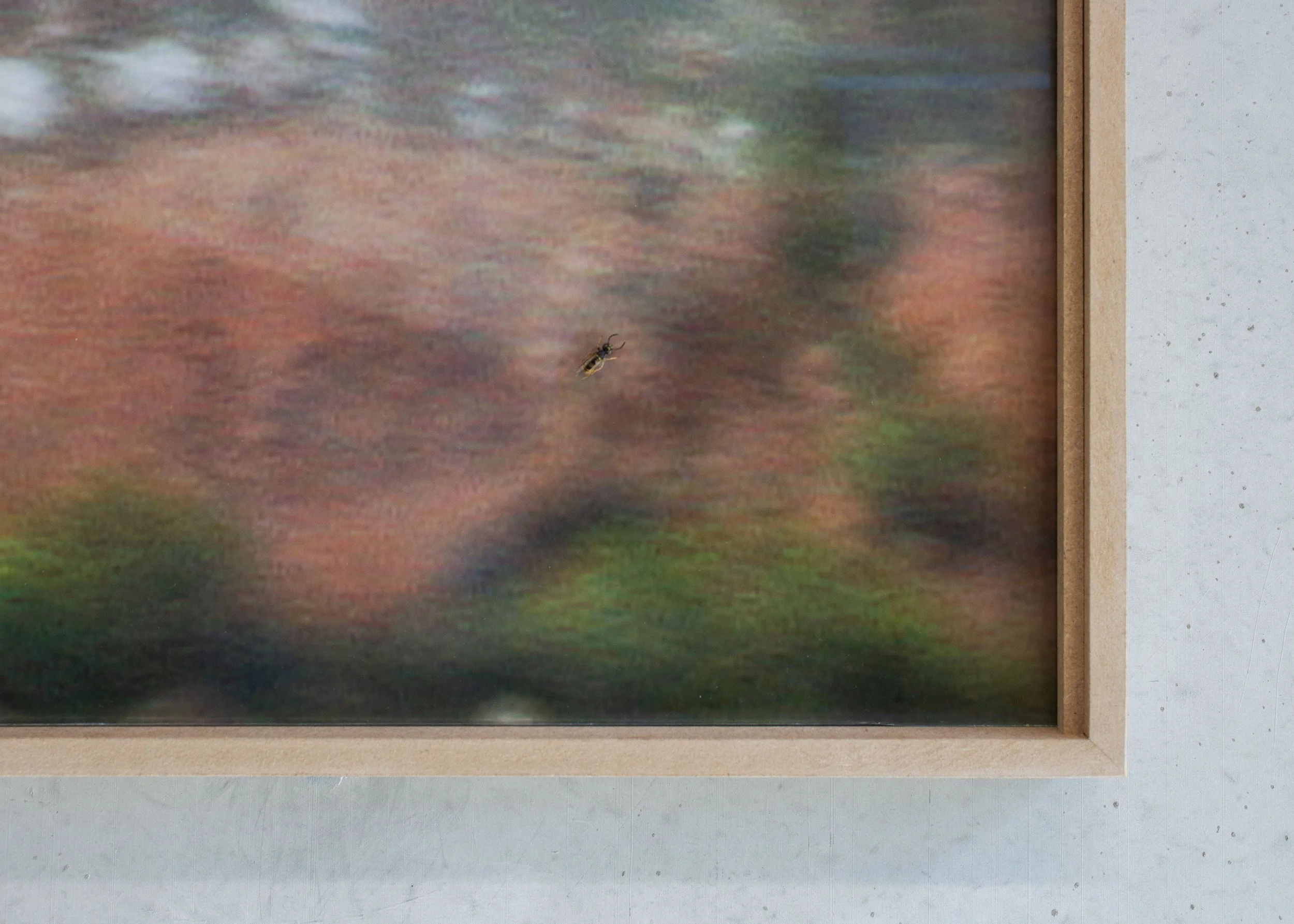 Valentin Hesch: suitcase dreams (detail), C-Print, note on paper, wasp, MDF frame, museum glass, 122 x 32 cm, 2023 / courtesy the artist / photo: Valentin Hesch